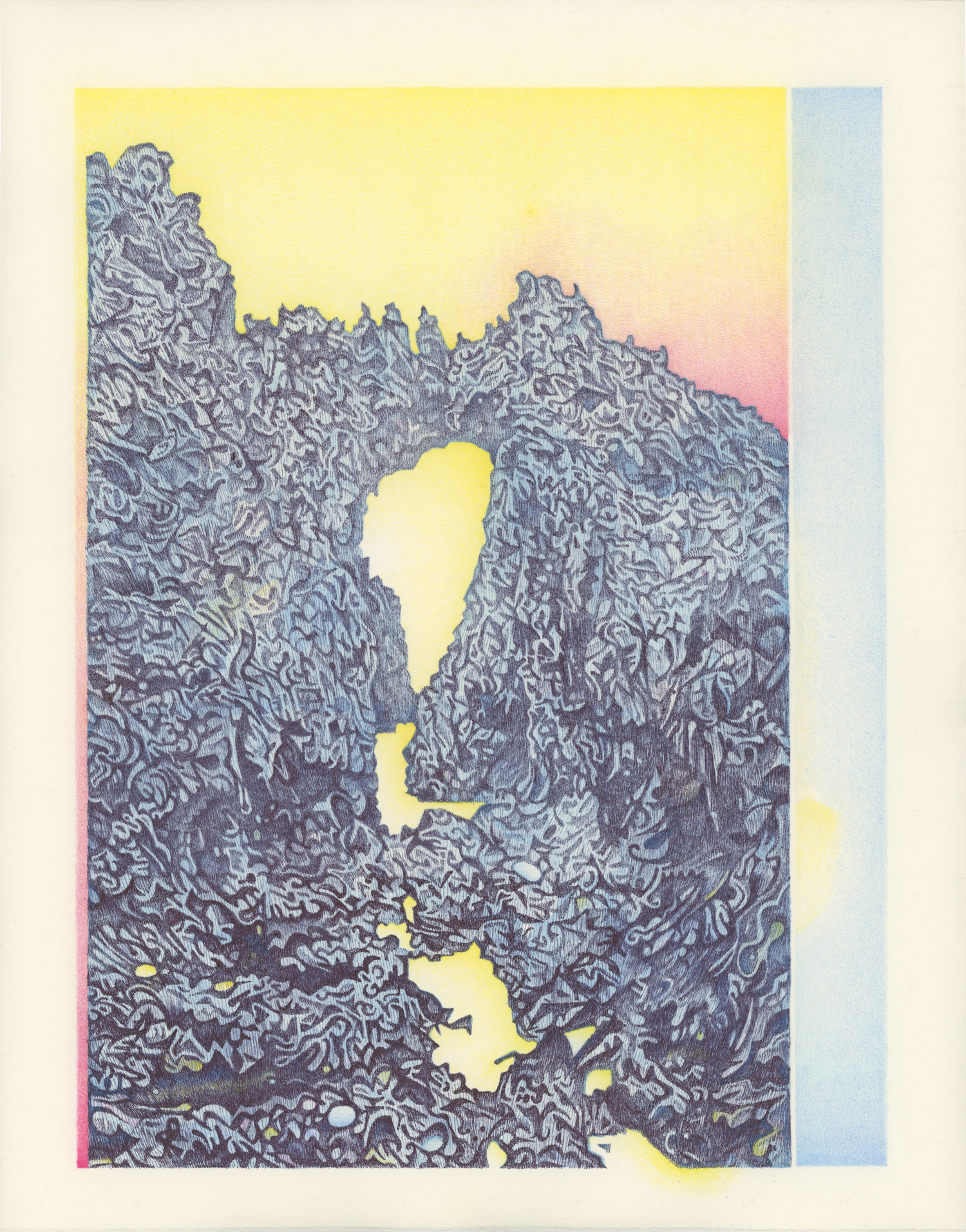 Inlet, 2026, ink and colored pencil on vintage engineer paper, 11 by 8.5 inches